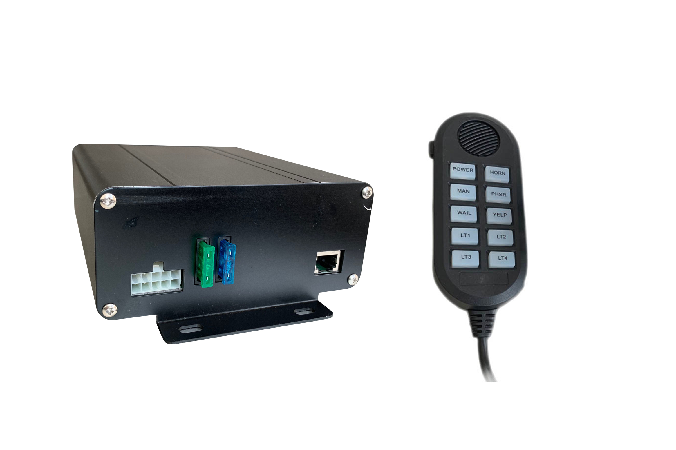 Unit featuring: one siren includes one or two handheld controllers, tones including horn,manual,power,stop,mech,wail,yelp,phaser, also with Light1,Light2 control switches